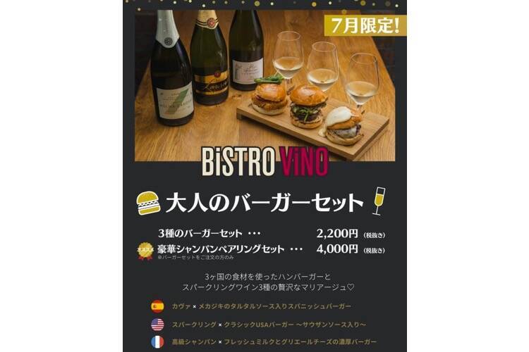 「BiSTRO ViNO六本木店」にて、7月の限定メニューとして、フランス・スペイン・アメリカの3カ国の食材を使った豪華ハンバーガーと、シャンパン3種のペアリングメニューが販売されます。