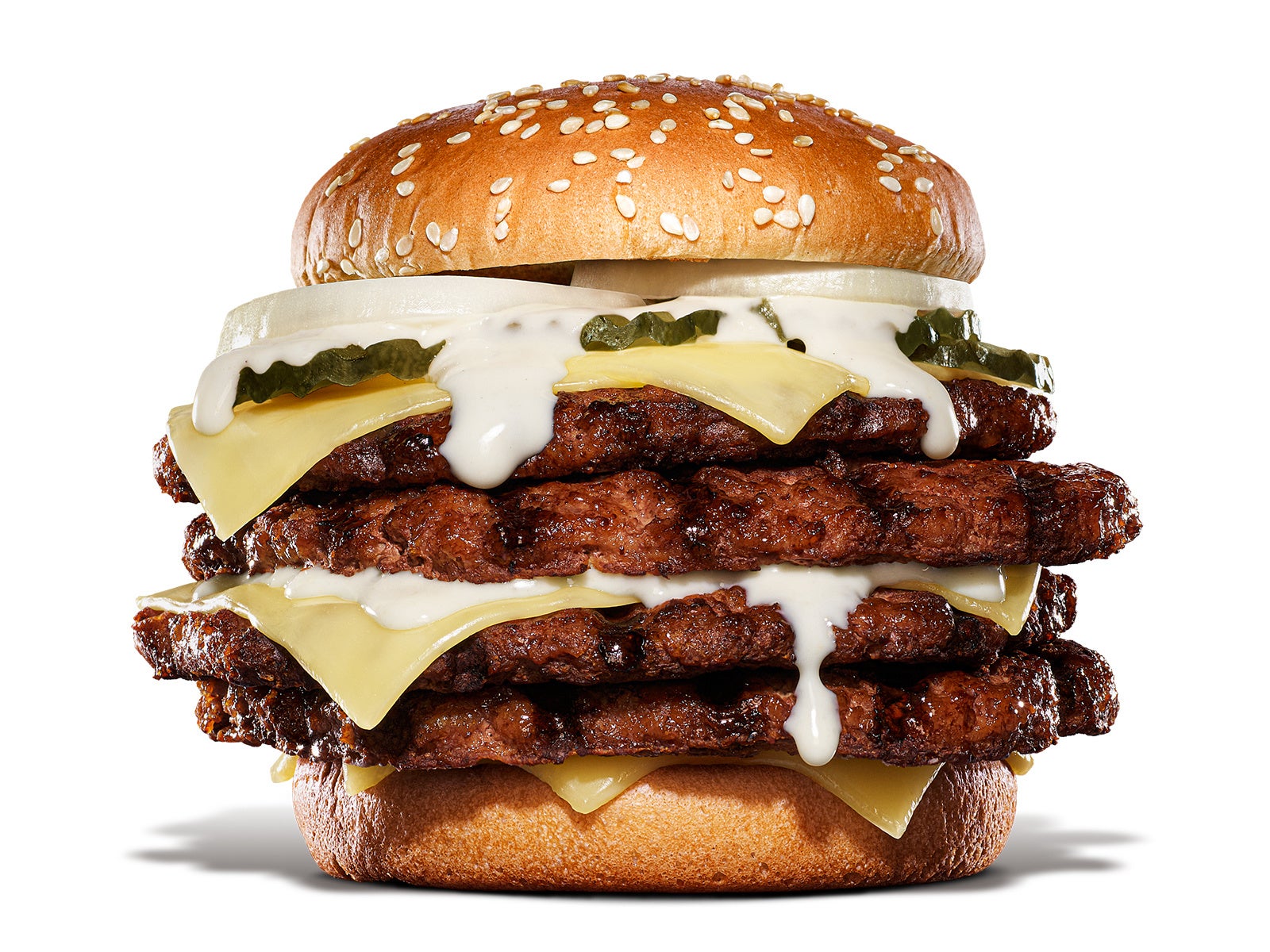 本シリーズの約3か月ぶりとなる新作として、直火焼きの100%ビーフパティ4枚とゴーダチーズスライス6枚をシーザーソースで仕上げた『キング・イエティ超ワンパウンドビーフバーガー』が登場いたします。