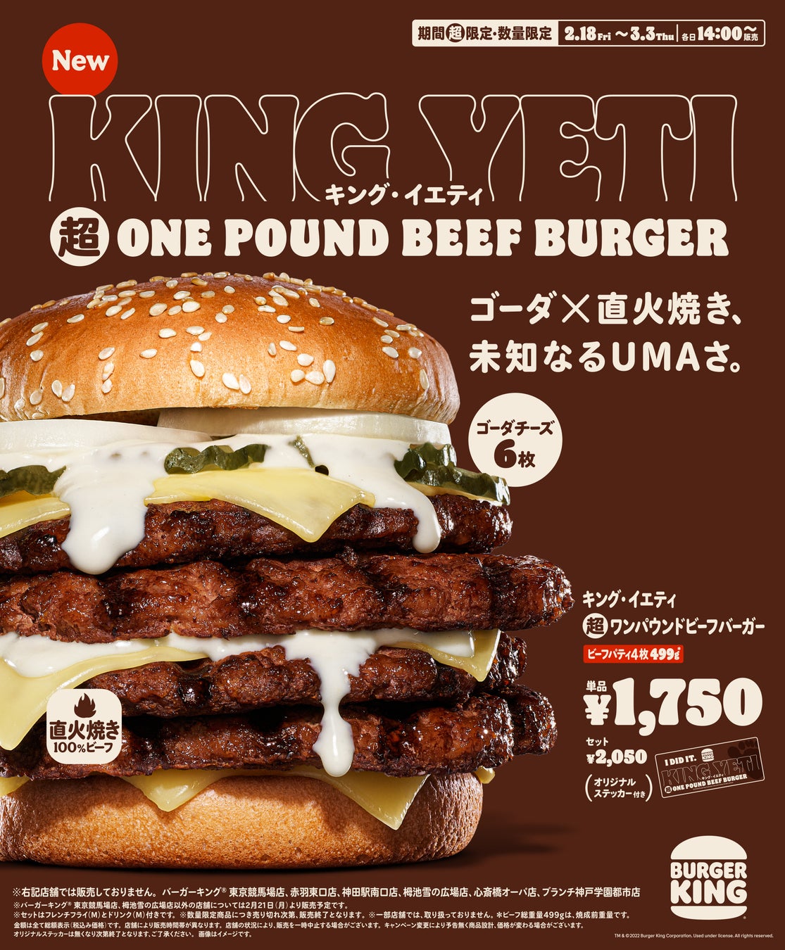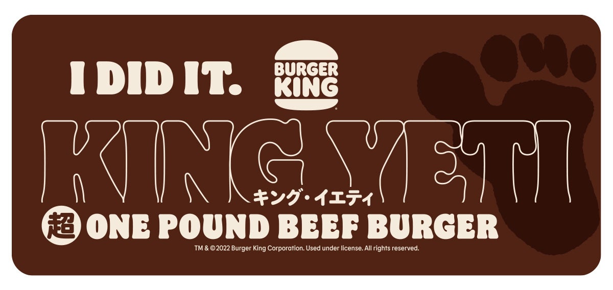 ぜひこの機会に、バーガーキング® 自慢の直火焼きの100%ビーフパティ4 枚にまろやかなゴーダチーズ6枚とシーザーソースが生み出す『キング・イエティ超ワンパウンドビーフバーガー』の未知なるUMAさを、最後の一口までお楽しみください。