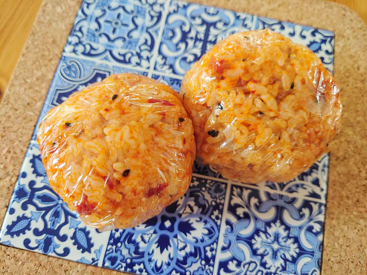 ごはんにハリッサとごまを入れて混ぜ、ラップに包んで丸めました。