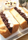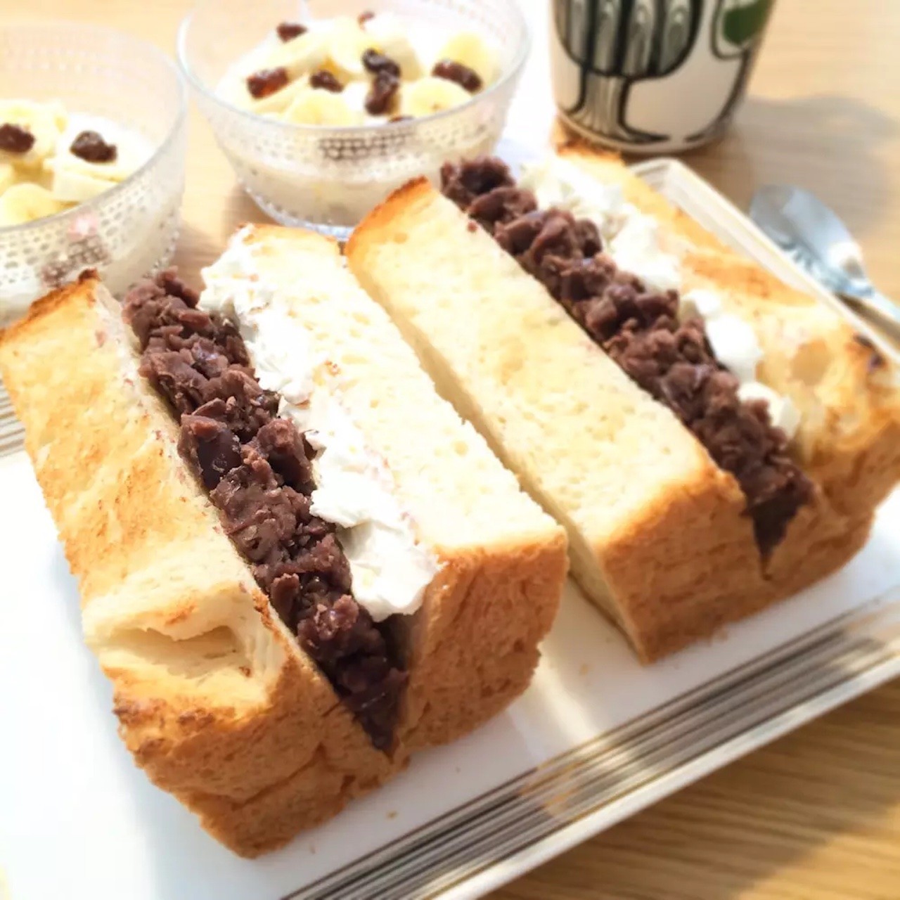厚切りトーストにたっぷりの小倉とクリチーを挟みました♡甘〜い小倉とさっぱりだけど濃厚なクリチーがお口の中でとろけます♡