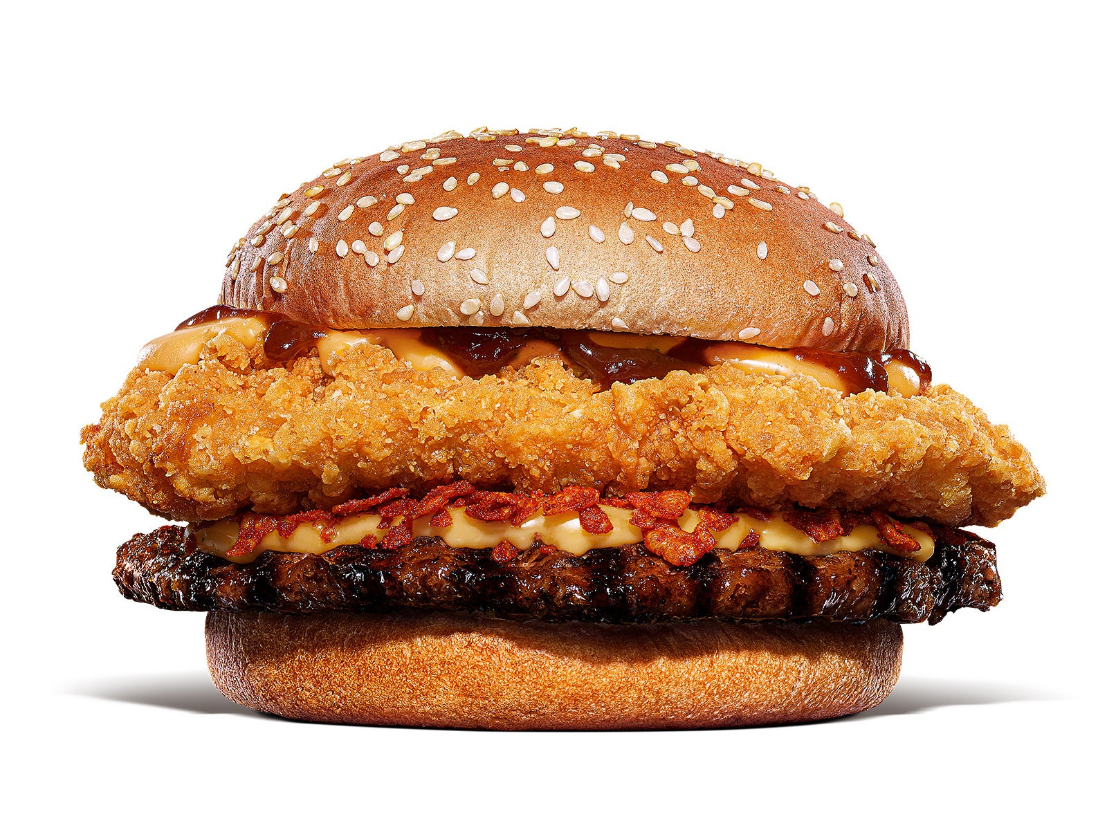 新発売の『ブッチャー・ダブルミートBBQチーズバーガー』は、バーガーキング® 自慢の直火焼きの100%ビーフパティに、約185g※4 の巨大鶏むね一枚肉を使用したジューシーでサクサクなチキンパティを豪快に重ねたダブルミートパティが楽しめる大型バーガーです。コク深く、渋みのあるスモーキーな「ブルズアイ™ BBQソース」と特製チーズソースに、クセになる辛さと旨味が特長の燻製辛口ガーリックフレークで仕上げました。ダブルミートのボリュームにBBQソースの旨味と刺激的な辛さをお楽しみいただけます。
