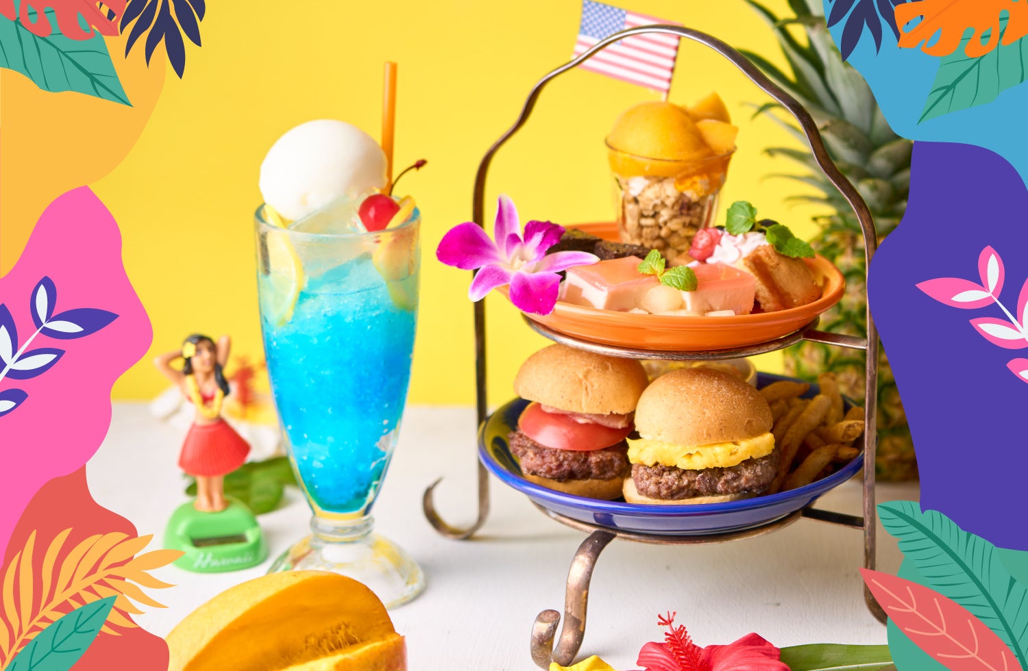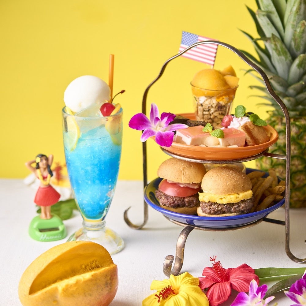 「ハワイアンスイーツ&ミニバーガーのアフタヌーンティープラン」は、マンゴーやベリーなどの南国スイーツがたっぷり楽しめる4種類のスイーツに加え、スパムとパイナップルが食欲をそそるミニバーガー・コールスロー・フライドポテトのお食事メニュー、更に鮮やかなブルーが爽やかな「ダブルレモンのブルーフロートソーダ」とソフトドリンク・カフェドリンクなど25種類のドリンク飲み放題がついたアフタヌーンティープランです。