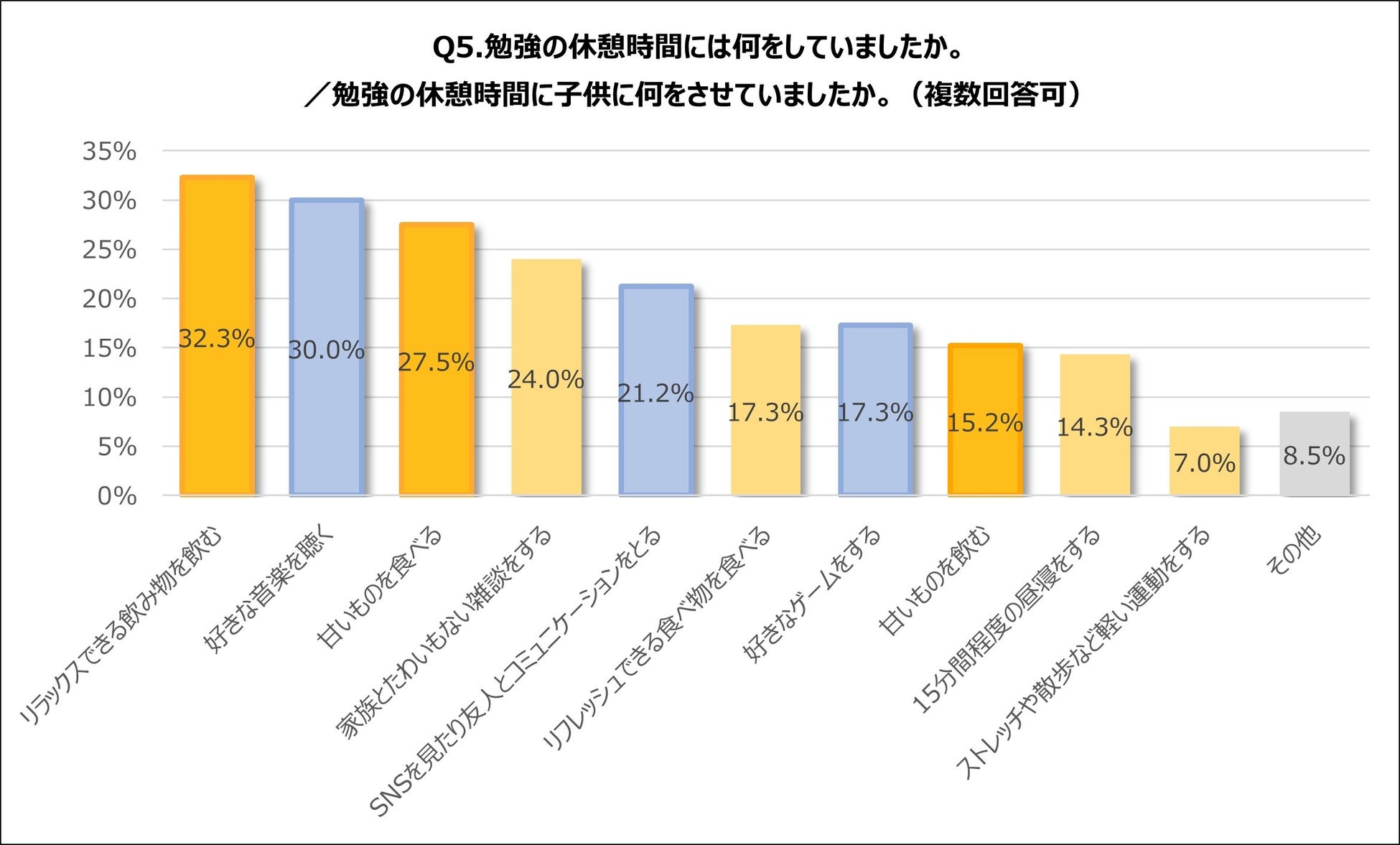 親にも「勉強の休憩時間に子どもに何をさせていましたか(複数回答可)」と聞くと、1位が「リラックスできる飲み物を飲む(36.7%)」、「家族とたわいもない雑談をする(32.7%)」、「甘いものを食べる(21.0%)」と回答。