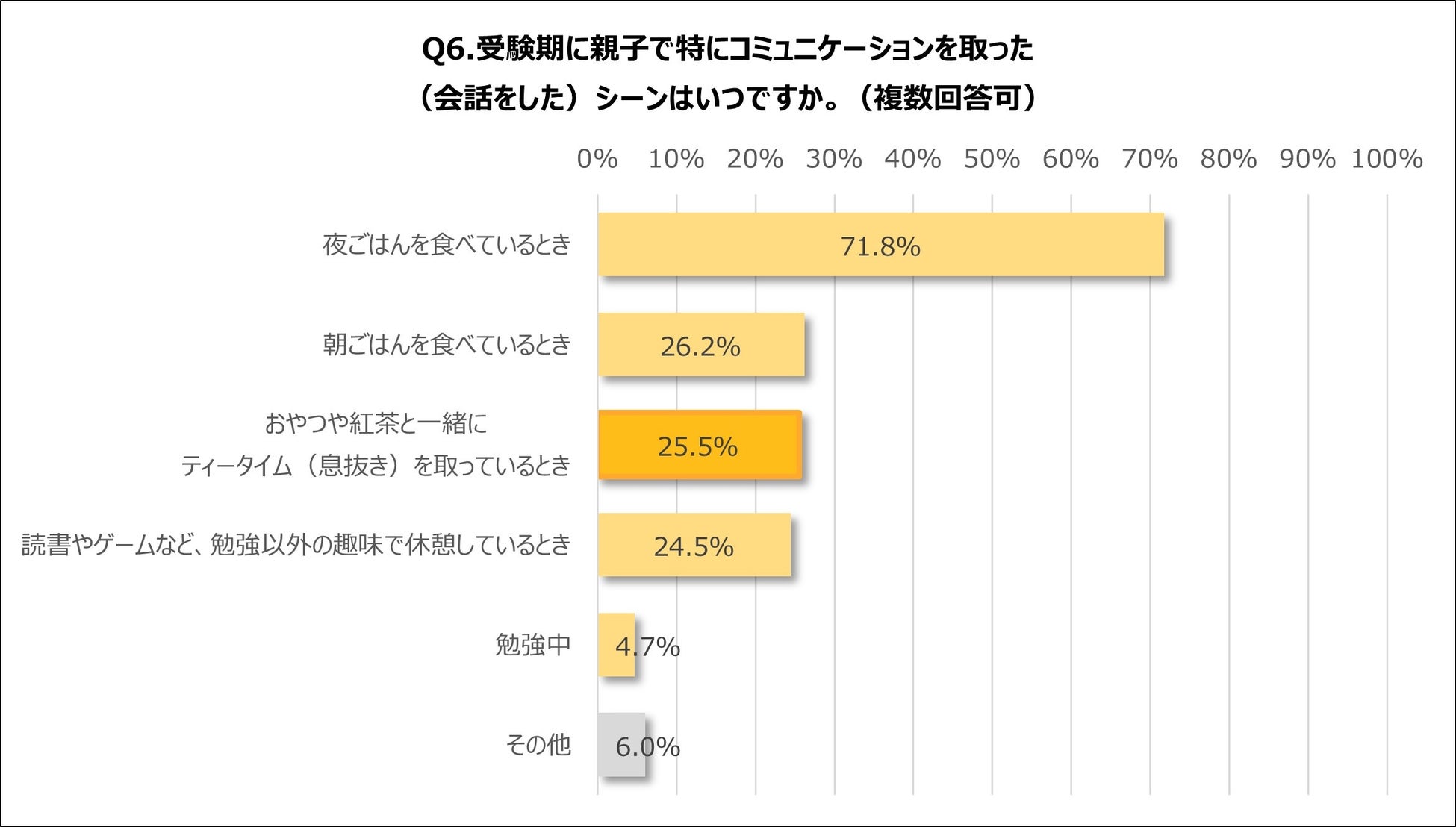 一方でまた、「おやつや紅茶と一緒にティータイム(息抜き)を取っているとき」の回答も上位を占めており、Q4の「休憩時間にしていたこと」の中でも「リラックスできる飲み物を飲む」ことが親子合わせて最もポイントが高いように、ティータイムをきかっけに、親子間のコミュニケーションが活発に生まれていることが判明しました。
