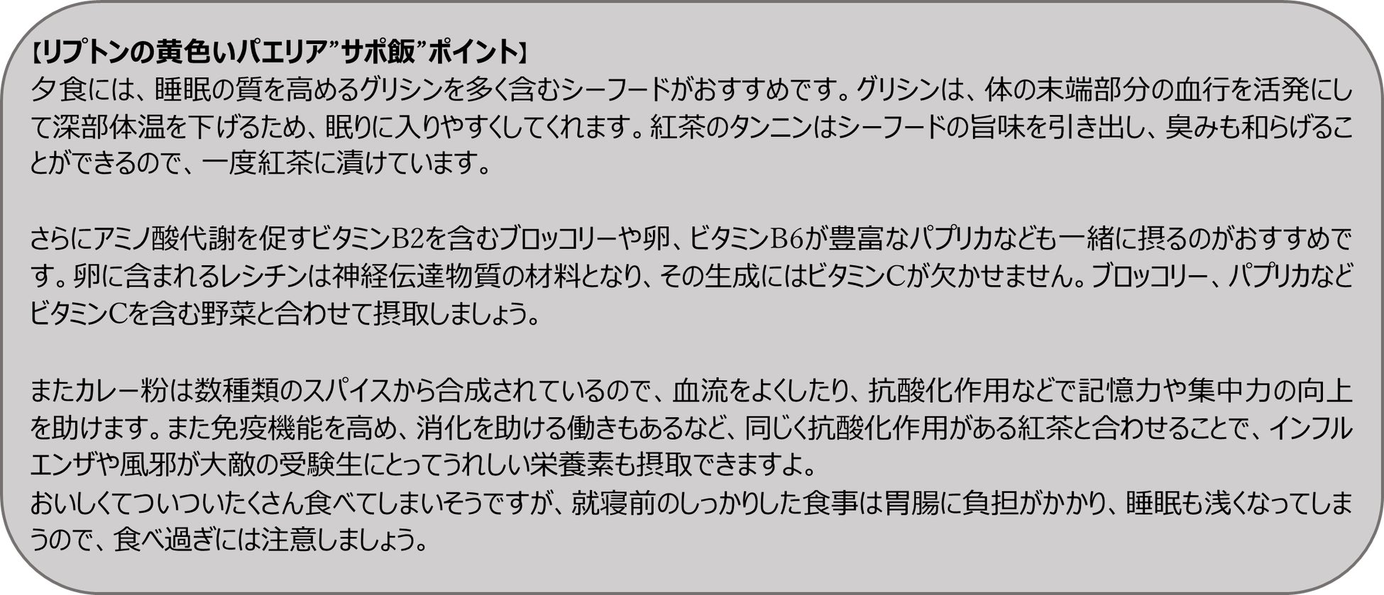 約7割のZ世代親子にとって最も会話が活発であった「夜ごはん」の時間には、親子で一緒に食卓を囲んで会話も弾む「リプトンの黄色いパエリア」がおすすめ。実は隠し味に「リプトン イエローラベル」を使っています。パエリア×カレー×紅茶のマリアージュは、味わいはもちろん記憶力や集中力をサポートするほか、睡眠の質を高める効果もある「サポ飯」としても大活躍。