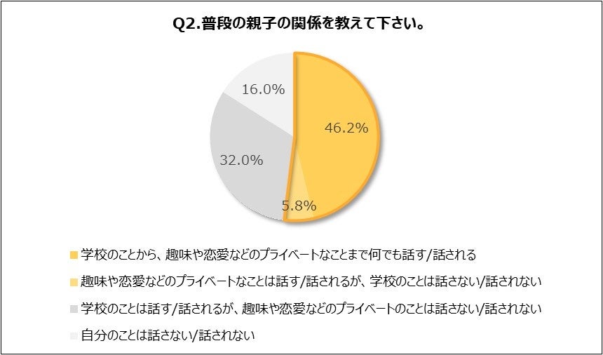 さらにZ世代受験生の半数以上が「趣味や恋愛などのプライベートなことまで何でも話す」友達のような関係と判明しました。中には、「一緒に推し活をしている」、「休日はいつも遊びに行く」、「何でもお互いに相談に乗る」親子や、「最も信頼している人が親」という声もあり、普段から親密なコミュニケーションを取っていることがわかりました。